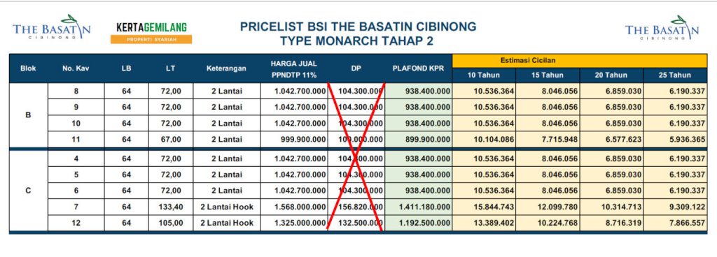 Berikut ini adalah detail pricelist dari Perumahan dekat pintu tol dan dekat KRL Cibinong: The Basatin Cibinong.