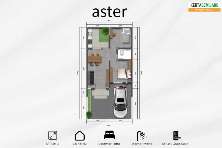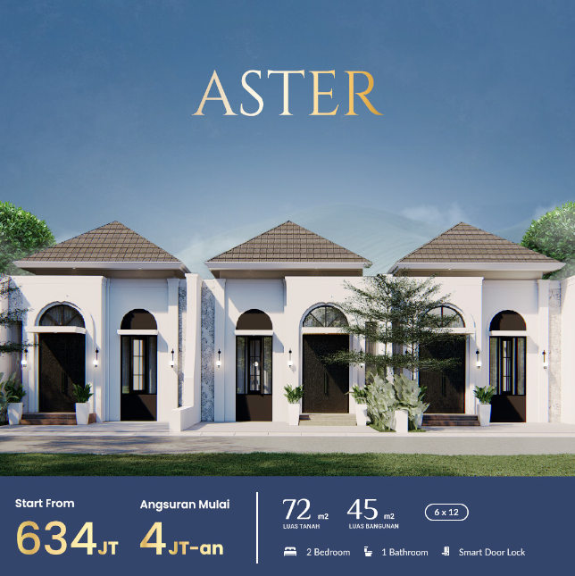 Tipe Aster adalah tipe 1 lantai dengan 2 kamar tidur. Dengan luas tanah 72m2 dan luas bangunan 45m2. Cicilan hanya 4 jutaan perbulan.