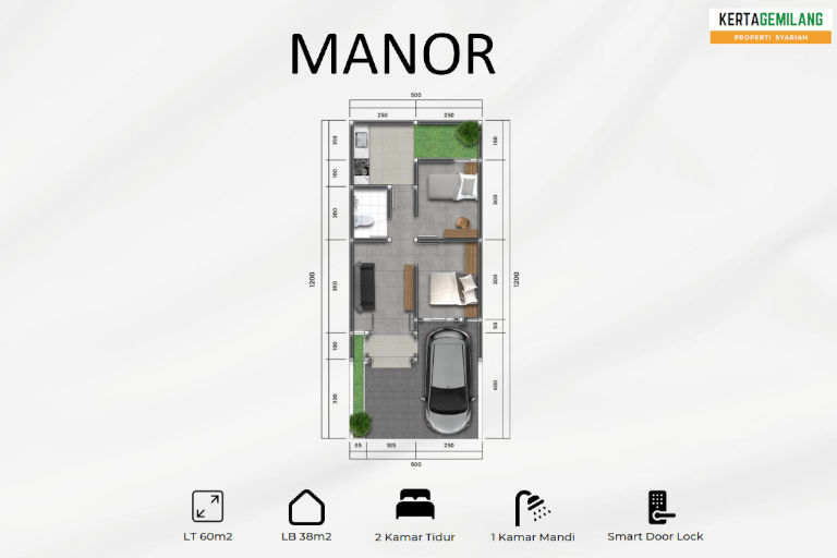 Tipe Manor merupakan tipe 1 lantai dengan 2 kamar tidur. Luas tanah 60 meter2, luas bangunan 38 meter2.  Cicilan mulai 3 jutaan perbulan.
