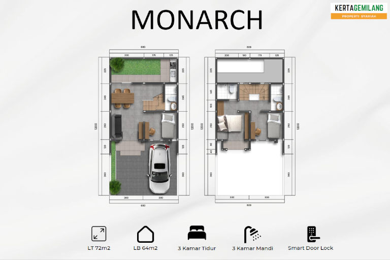 Tipe Monarch adalah tipe tertinggi, merupakan tipe 2 lantai dengan 3 kamar tidur. Luas tanah 72 meter2 dan luas bangunan 64 meter2